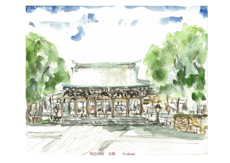 7月30日の朝 東京にいて私の仕事は10時半から。この日は、明治天皇崩御の日でお祭りがある。神主に先導された黒服の集団が恭しく本殿に入っていき、荘厳なる雅楽の響きが始まる。そこへ、雀の大群のごとき中国人団体旅行客。私の描きかけの絵を無遠慮にのぞき込んで、あれやこれや発音している。不敬罪で逮捕すると言うわけにもいかん。これが国際化なんでしょう。